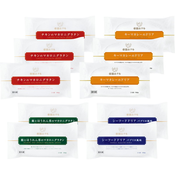 ●内容/チキンのマカロニグラタン・キーマカレードリア×各3、鮭とほうれん草のマカロニグラタン・シーフードドリア パプリカ風味×各2、各105g  ※同一お届け先に複数個ご用命の場合でも、個別に送料がかかります。 ※配送不可地域:沖縄県・離島