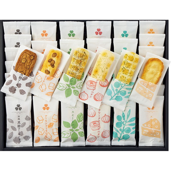 ●内容/バージンオリーブオイル・スイートバジル・サワークリームオニオン・アーモンドミモレット×各6、沖縄黒糖アーモンド・スモークチーズ×各8