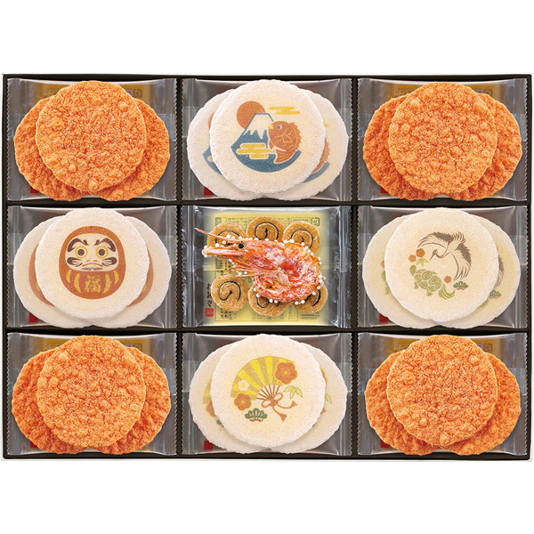 ●内容/赤えび炙り焼き×12袋、富士と鯛・だるま・鶴と亀・松竹梅×各3袋、甘えび浜焼き×2袋