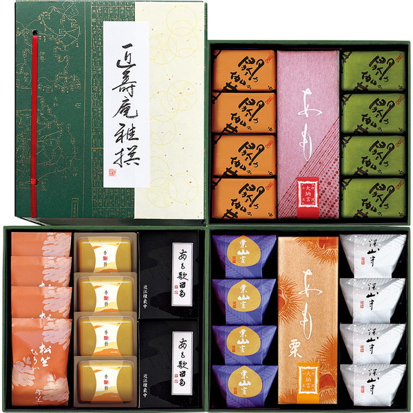 ●内容/あも・あも(栗)×各1、あも歌留多(最中種)×2、閼伽井(黒蜜きなこ)・閼伽井(抹茶)・栗山家・深山守・松笠ひろい・季折×各4