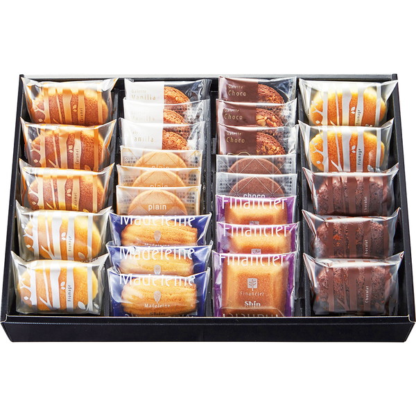 ●内容/スフレフロマージュ×4個、マドレーヌ×3個、フィナンシェ×3個、スフレショコラ×3個、スフレキャラメル×3個、ガレット(バニラ)×3個、ガレット(チョコ)×3個、サブレ(プレーン)×3個、サブレ(チョコ)×2個