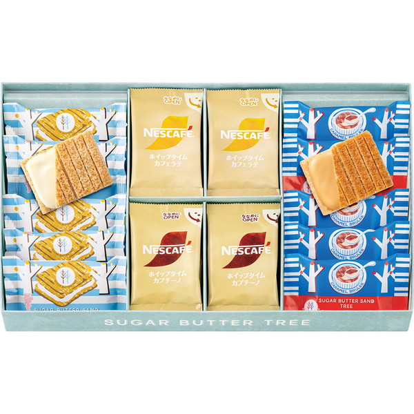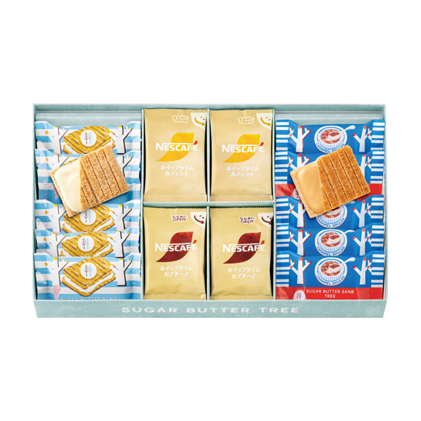 ●内容/シュガーバターサンドの木×6、シュガーバターサンドの木 キャラメルブリュレ×6、ネスカフェ ホイップタイム カフェラテ×8、ネスカフェ ホイップタイム カプチーノ×8