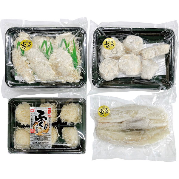 ●内容/国産ふぐ唐揚げ180g×1、国産ふぐ一汐180g×1(1~2尾)、国産ふぐカツ180g×1、ふぐ入りしゅうまい×6粒