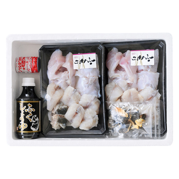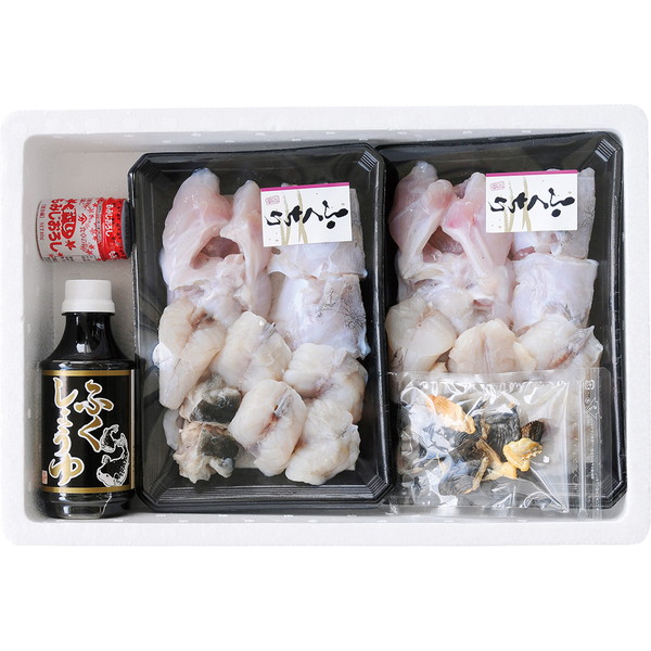 ●内容/ふぐちり(とらふぐあら200g、まふぐ鍋用切身300g)×2、特製ふぐ醤油300ml、もみじおろし40g、焼きヒレ5g