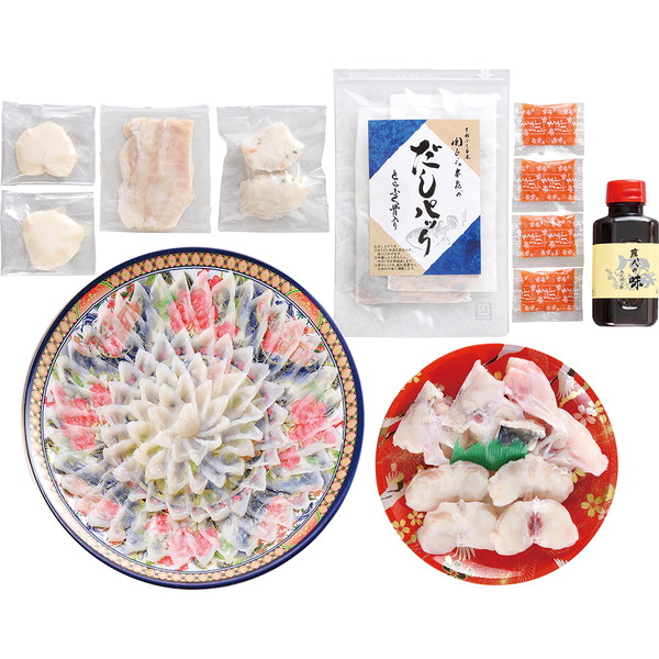 ●内容/とらふぐ刺身(30cm皿)110g、とらふぐちり(切身・アラ)300g、とらふぐ身皮4枚、とらふぐ焼き白子(白子酒用)20g×2、ふぐしんじょう40g×2、だしパック(とらふぐ骨入り)18g×2、ふくポン酢180ml、もみじおろし10g×5※お申し込み期間:12月14日(日)迄
