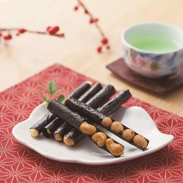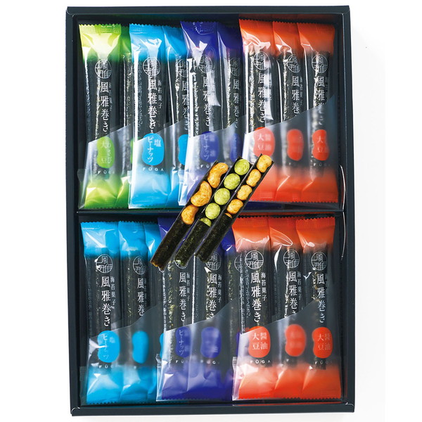 大豆に衣を付け、ピリッとしたわさび風味のたれで味付けや、若い方にも風雅巻きを知っていただく様、ピーナッツなどバリエーション豊かに詰合せしました。