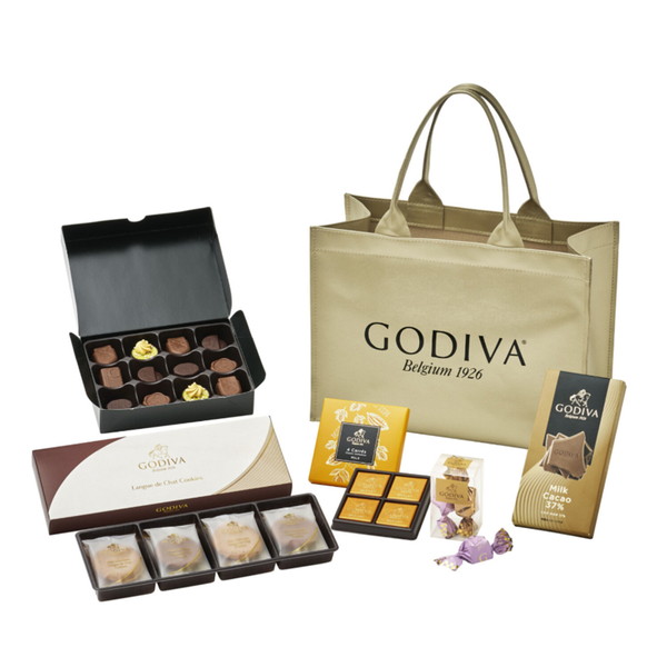 ●内容/2026 ニューイヤー ハッピーバッグ A アソートメント 12粒入、2026 ニューイヤー ハッピーバッグ G キューブ アソートメント 3粒入、カレ ミルク 4枚入、ゴディバタブレット ミルク カカオ 37%、ラングドシャクッキーアソートメント 8枚入、ゴディバオリジナルバッグ