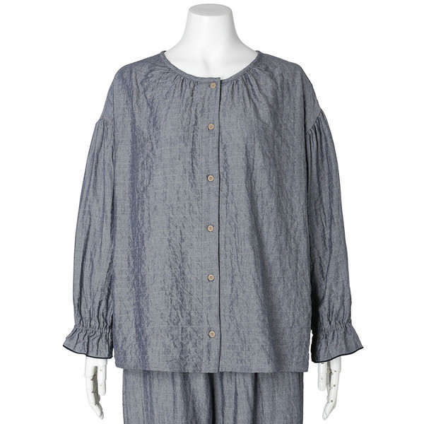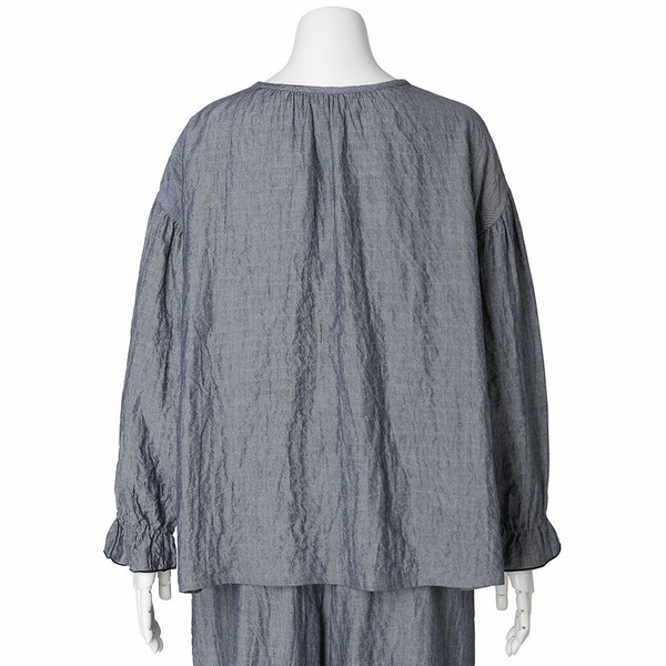 襟もとや袖のギャザー使いで、ふんわりとしたシルエットに仕上げた長袖トップス。