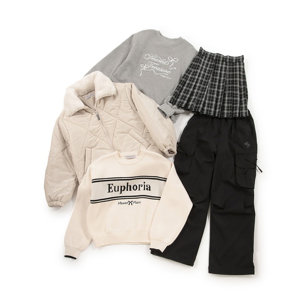 ●内容/ファーカラーキルティング中綿ジャケット(表地:ポリエステル100%、裏地:ポリエステル100%、中綿:ポリエステル100%、ファー部分:基布ポリエステル100%)・ロゴジャガードニット(ポリエステル30%・レーヨン27%・アクリル25%・ナイロン18%)・ゆったりトレーナー(本体:綿100%、リブ部分:綿94%・ポリエステル4%)・2WAYカーゴパンツ(ポリエステル100%)・プリーツスカパン(表地:ポリエステル80%・レーヨン20%、裏地:綿58%・ポリエステル48%)
