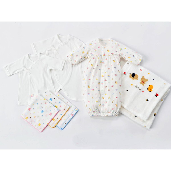 ●内容/短肌着50-60cm(綿100%)、コンビ肌着50-60cm(体重3-6kg・綿100%)、ツーウェイドレス春夏用50-70cm(体重3-9kg・綿100%)、バスタオル90×90cm(無撚糸タオル裏ガーゼ)、ハンカチ34×34cm3枚組