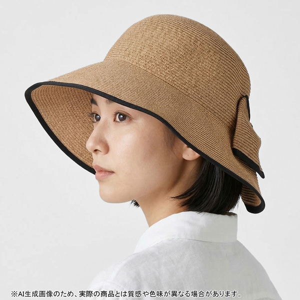 本体と一体型のリボン飾りがテクニカルなデザインが特徴で、つばの長さは約10.5㎝で紫外線遮蔽率は98%と日よけ対策にも活躍します。