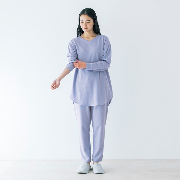●サイズ/トップス:フリーサイズ(着丈82cm、肩幅50cm、身幅55cm、裾幅61cm、袖丈51cm、袖口幅9.5cm)・パンツ:L(ウエスト74cm、ヒップ114cm、股上34cm、股下66cm、裾幅17cm、総丈100cm)
