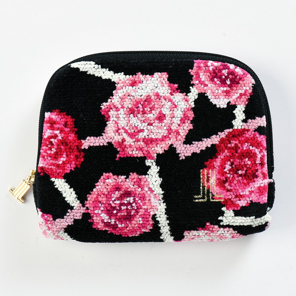 大胆なバラモチーフが印象的なデザインのポーチは使いやすいサイズ感で、JLマークのチャームがアクセントになっています。