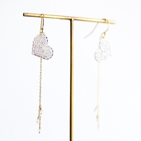 ハートと天然石のついたチェーンが揺れて、お顔周りを華やかに彩ってくれます。