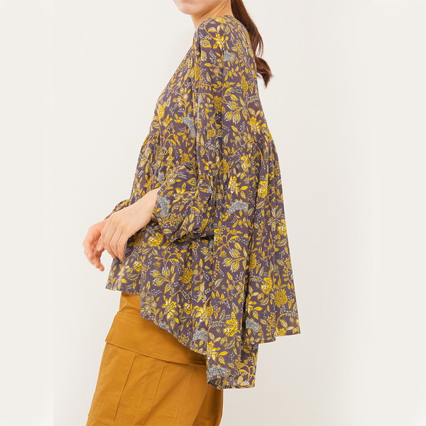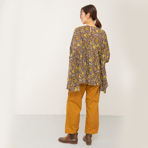 裾の広がりや背中のスリットが軽やかさを添え、パンツにもスカートにも合わせやすい一枚です。