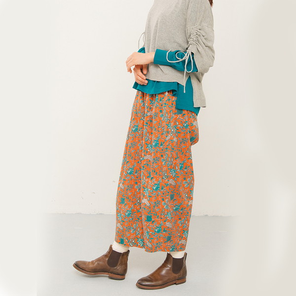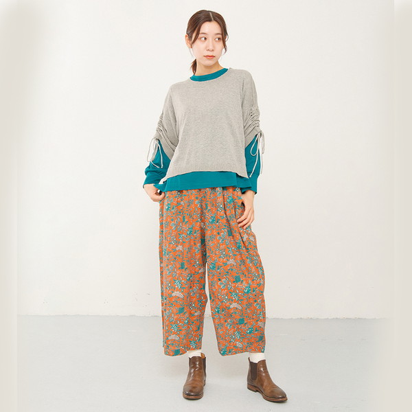 動くたびに柔らかく揺れるシルエットは上品で、足首がのぞく軽やかな丈感が抜け感を演出します。