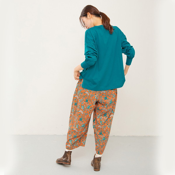 ウエストはゴム仕様で快適にフィットし、腰まわりにゆとりを持たせたリラックス感のある設計。