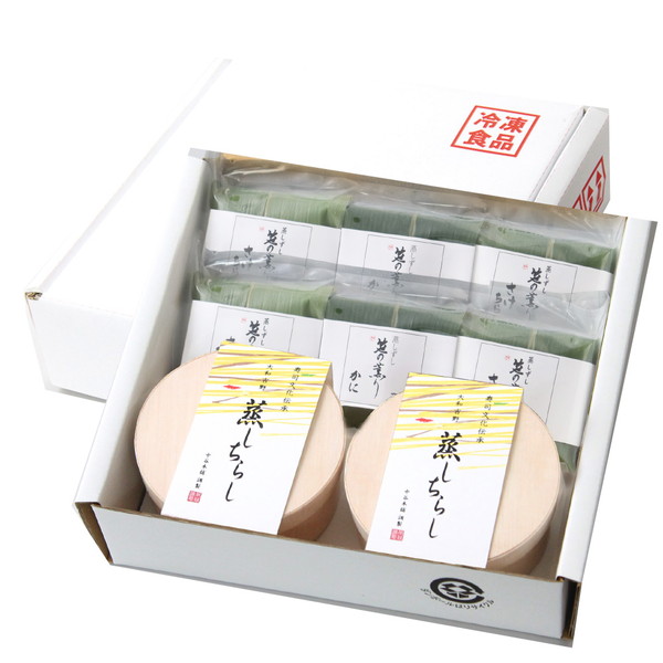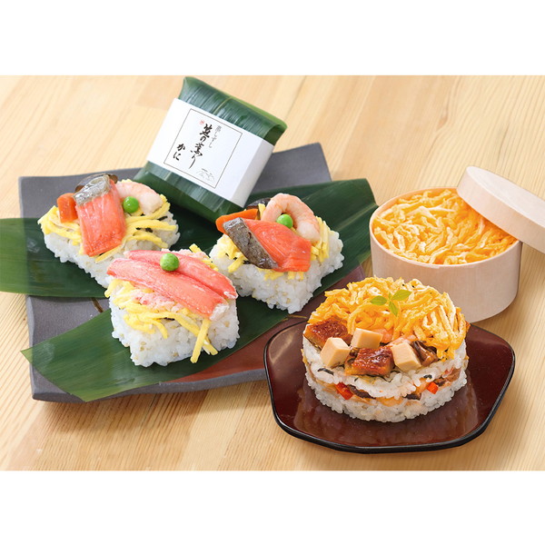 ●内容/笹巻蒸しちらし(かに)×2個、笹巻蒸しちらし(さけ)×4個、蒸し寿司(わっぱ)×2個