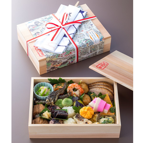 ●内容/1~2人前(紅白ご飯(赤飯 白蒸)・穴子手まり寿司・鶏そぼろ三つ葉入り厚焼卵・鱒幽庵焼木の芽・合鴨ロース柔か煮・小芋旨煮空揚・尼子(あまご)南蛮漬け・小茄子田楽・卵黄茶巾絞り・かます風干酒焼・鯛一塩大根おろし和え・青竹串刺し(車海老旨煮、胡瓜、蒟蒻煮)・青海苔麩分葱辛子酢味噌和え・湯葉揚げ旨煮山椒焼・一寸豆塩茹で・千代結び蒲鉾・奈良漬・生姜甘酢漬)