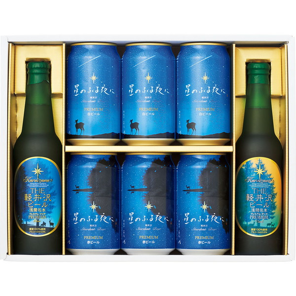 ●内容/星のふる夜に(白ビール・赤ビール各350ml×各3/缶)、THE軽井沢ビール(プレミアムクリア・プレミアムダーク各330ml×各1/瓶)