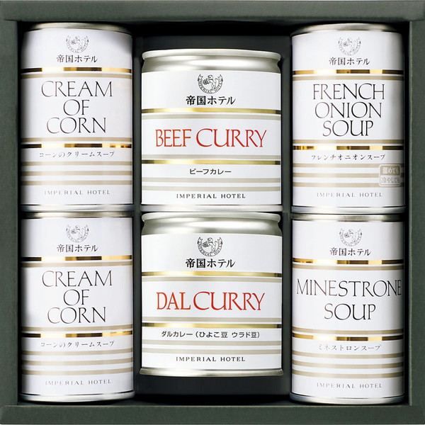 ●内容/コーンのクリームスープ×2、フレンチオニオンスープ・ミネストロンスープ×各1、各160g、ビーフカレー190g・ダルカレー(豆のカレー)180g×各1/プルトップ缶