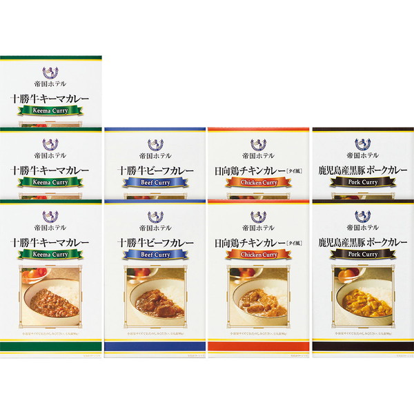 ●内容/十勝牛キーマカレー×3、十勝牛ビーフカレー・日向鶏チキンカレー(タイ風)・鹿児島産黒豚ポークカレー×各2、各90g