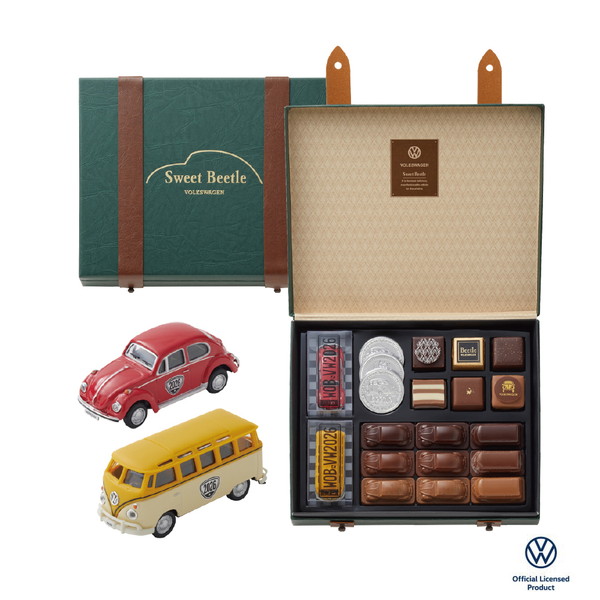 革張りのトランクをイメージしたボックスに、ミニチュアのビートル型、バス型チョコレート、キラリと光るコイン型チョコレート、ナッツやフルーツの味わいのチョコレートを詰め合わせました。