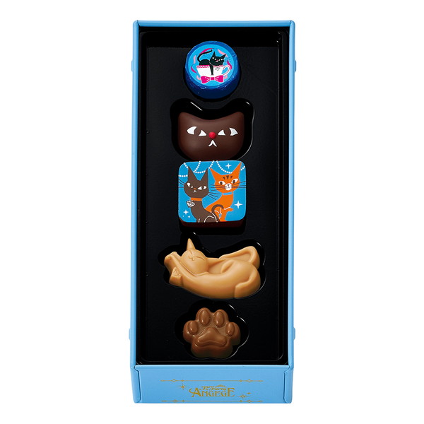 魔法のティーパーティーとアンジュジュを描いた缶に、猫型プリントチョコレートや、肉球型のチョコレートを詰め合わせました。