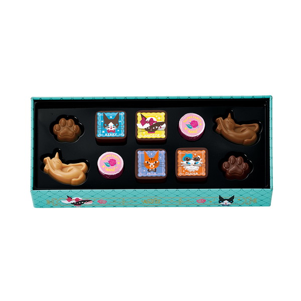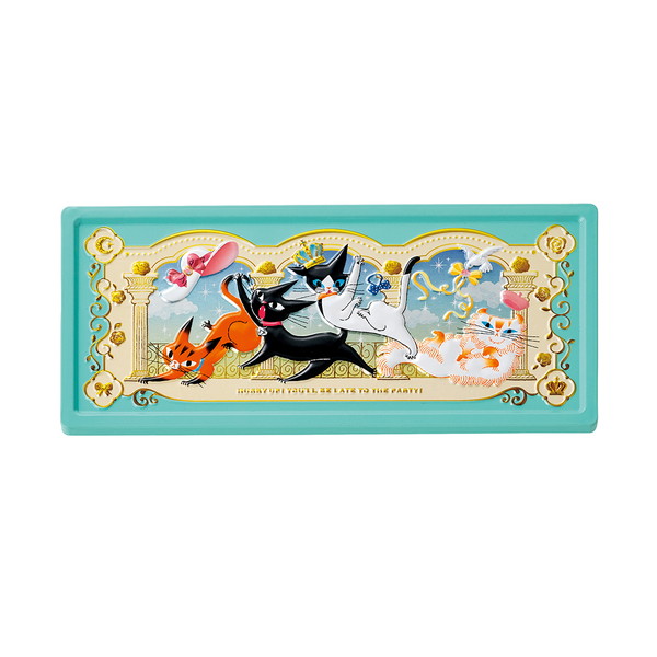 パーティー会場に向かう4匹を描いた缶に、4匹のプリントチョコレートやアンジュジュ型や肉球型のチョコレートを詰め合わせました。