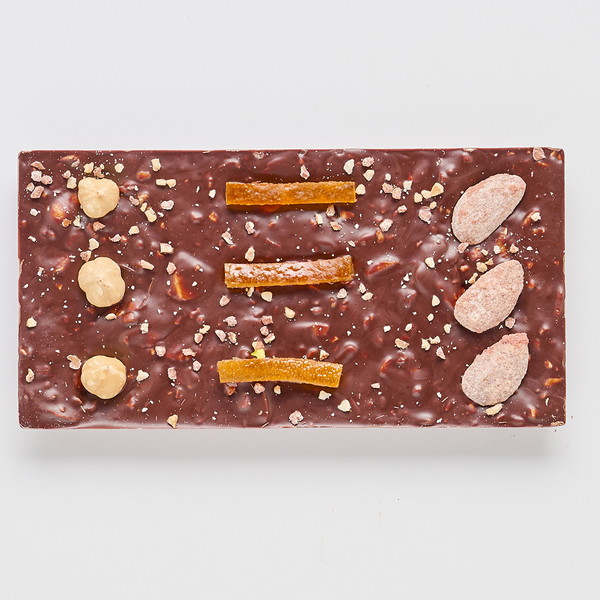 ダークチョコレート55%のタブレットに、はちみつでグリルしたスライスアーモンドなどをのせた定番のマンディアン。