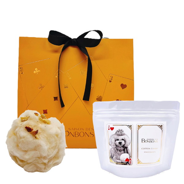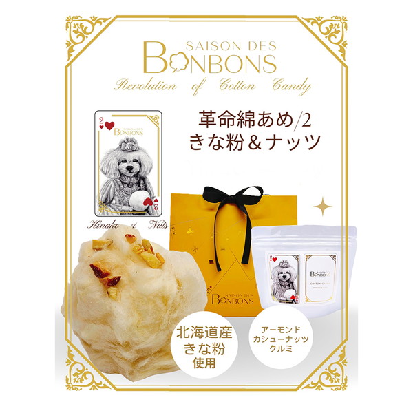 北海道きな粉の甘く香ばしい風味が口いっぱいに広がる、きめ細かい綿あめに、歯ごたえのあるミックスナッツが絡んだ、新しい食感のお菓子です。
