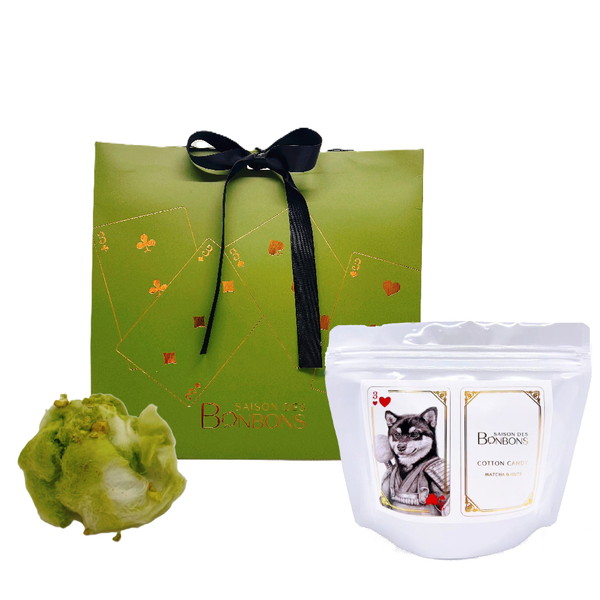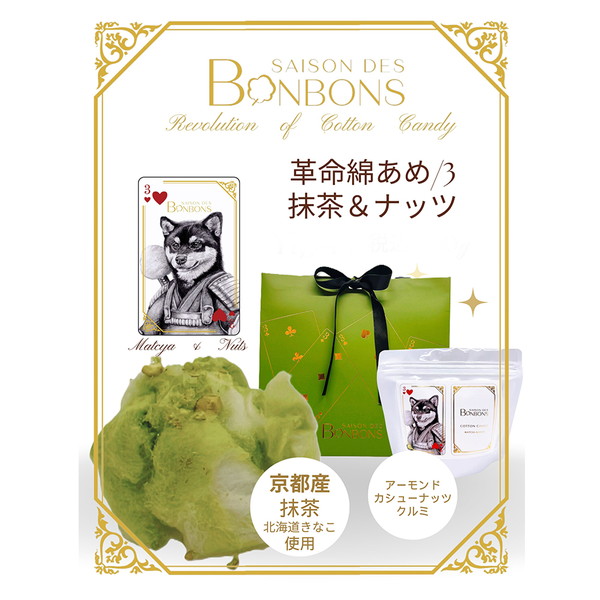 京のお抹茶の香りと濃厚な味わいが口いっぱいに広がるきめ細かい綿あめに、歯ごたえのあるミックスナッツが絡んだ、新しい食感のお菓子です。
