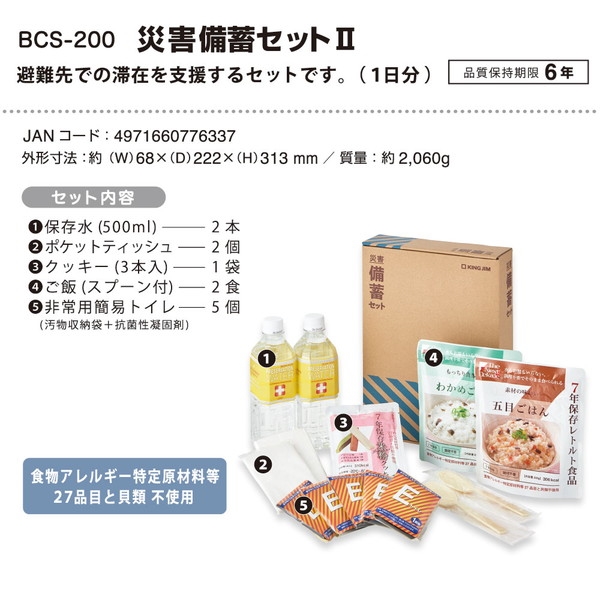 ●セット内容:保存水(500ml)×2本 、ポケットティッシュ×2個 、クッキー(3本入)×1袋、ご飯(スプーン付)×2食、非常用簡易トイレ×5個