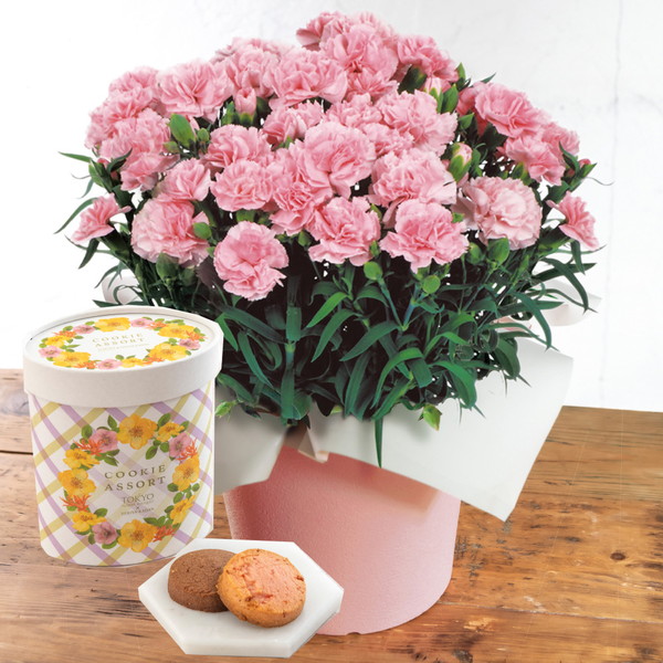 ●内容/カーネーション「感謝の気持ち」ピンク(5号)、東京フラワーブーケ「クッキーアソート」6個(賞味期限:120日、サイズ:約10×7×11.5cm、特定原材料:卵・乳・小麦・アーモンド・大豆)、Thanksカード、品質カード