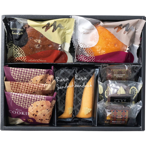 ●内容/レーズンサンド・レーズンクッキー×各2個、ブラウニー(ネーブル・ドライフルーツ&ナッツ)・マドレーヌ(プレーン・チョコ)・チョコレートケーキ・チョコチップクッキー×各1個