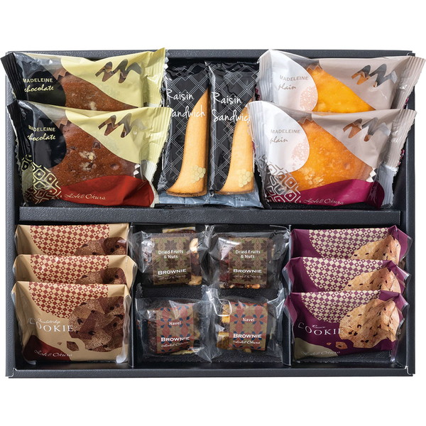●内容/レーズンクッキー・チョコチップクッキー×各3個、レーズンサンド・ブラウニー(ネーブル・ドライフルーツ&ナッツ)・マドレーヌ(プレーン・チョコ)×各2個