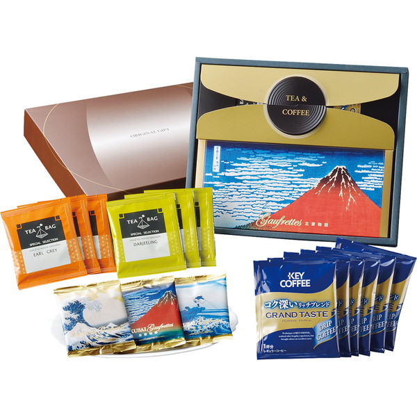 ●内容/北斎ゴーフレット12枚入(バニラ・チョコレート・抹茶) 紅茶ティーバッグ 2.5gx6袋  ドリップコーヒー 6gx6袋