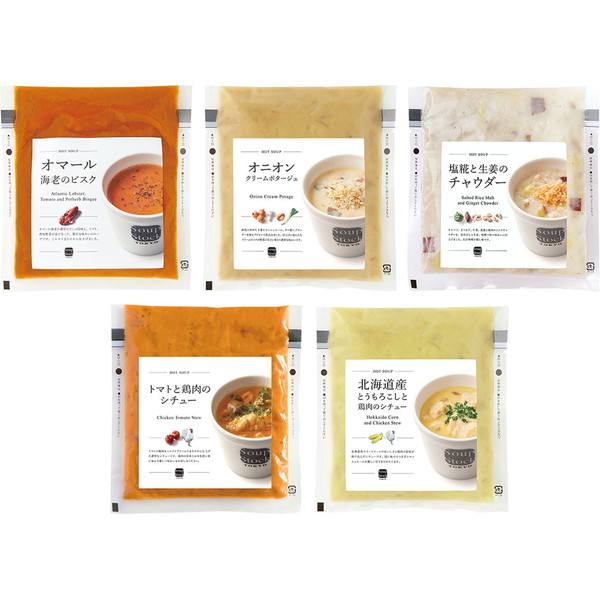 ●内容/オマール海老のビスク・オニオンクリームポタージュ・塩糀と生姜のチャウダー・トマトと鶏肉のシチュー・北海道産とうもろこしと鶏肉のシチュー 各180g