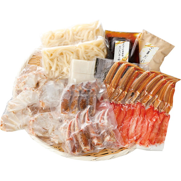 ●内容/生ずわい蟹1kg、うどん250g・切り餅50g×各2、昆布、ごまだれ200ml、だいだいポン酢200ml