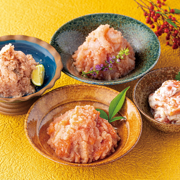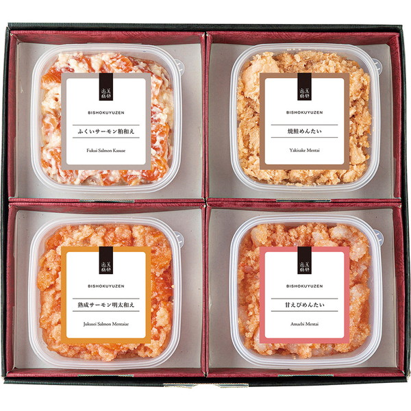 ●内容/ふくいサーモン粕和え・焼鮭明太子・サーモン明太和え・甘えび明太子 各150g