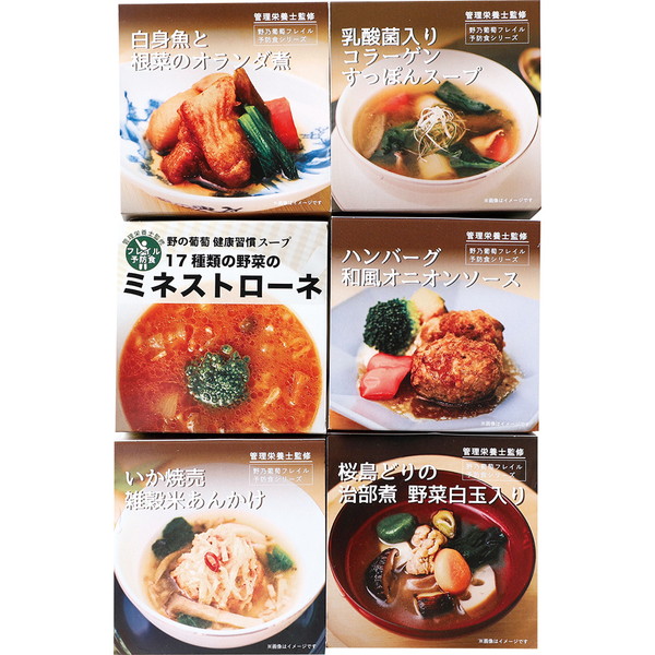●内容/烏賊しゅうまい 雑穀米餡かけ・ハンバーグ和風オニオンソース・白玉入り桜島鶏の治部煮・白身魚と根菜のオランダ煮 各130g、17種類の野菜のミネストローネ・乳酸菌入りコラーゲンすっぽんスープ 各150g