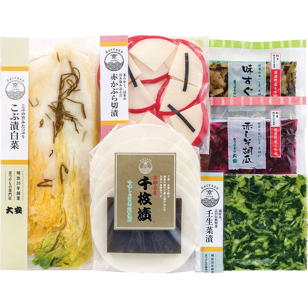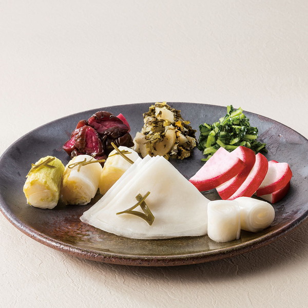 ●内容/千枚漬70g、赤かぶら切漬62g、こぶ漬白菜132g、壬生菜漬・味すぐき・赤しそ胡瓜 各40g