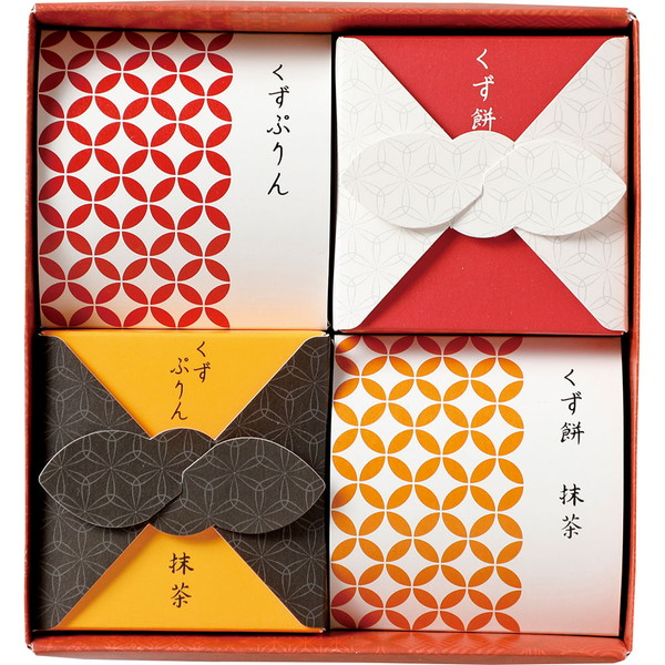 ●内容/くず餅(プレーン・抹茶) 各75g×2、きな粉・黒蜜 各5g×4、くずぷりん(プレーン・抹茶) 各75g×2