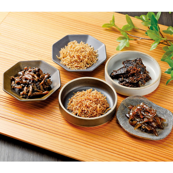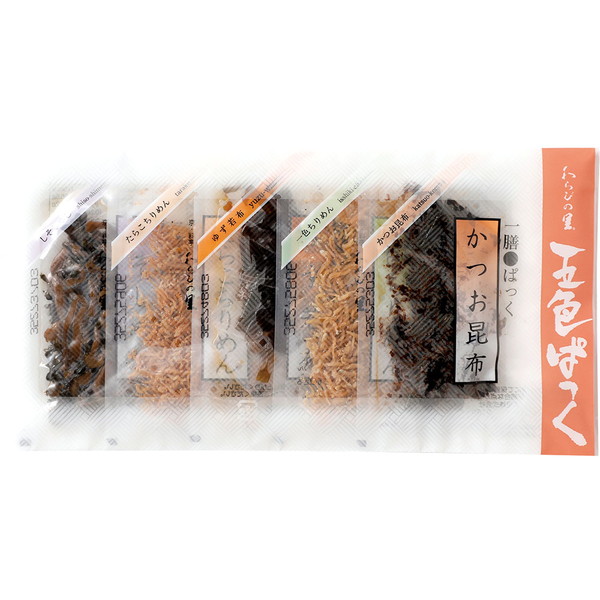 ●内容/かつお昆布・ゆず若布・しそしめじ 各15g、一色ちりめん・たらこちりめん 各8g