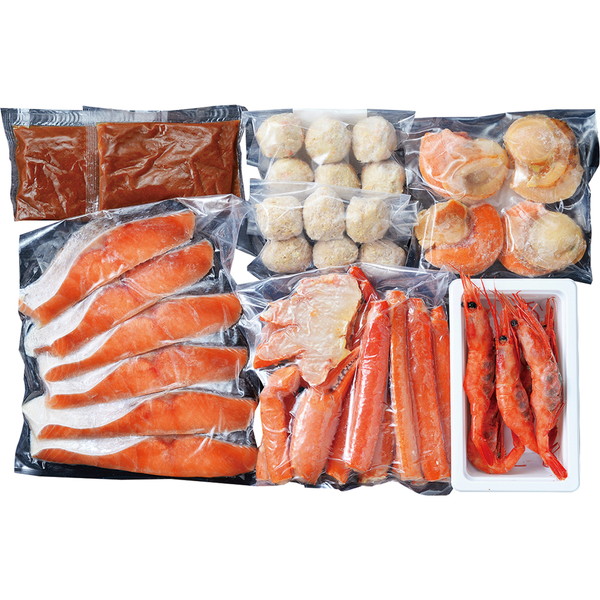 ●内容量/生紅ずわい蟹カット250g、鮭切身40g×6、ボイル帆立130g、かに入りすり身80g、鶏団子80g、甘えび80g、味噌タレ55ml×2