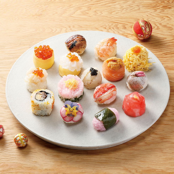 ●内容量/蕪花手毬、春小鯛桜手毬、桜俵手毬、三色手毬、フグ手毬、ラディッシュ華てまり、いくら錦糸巻、イカ菊花手毬、帆立菊花手毬、海老手毬、生うにトロサーモン巻、本ずわい手毬、穴子たまご手毬、プルコギロール、うなぎ手毬