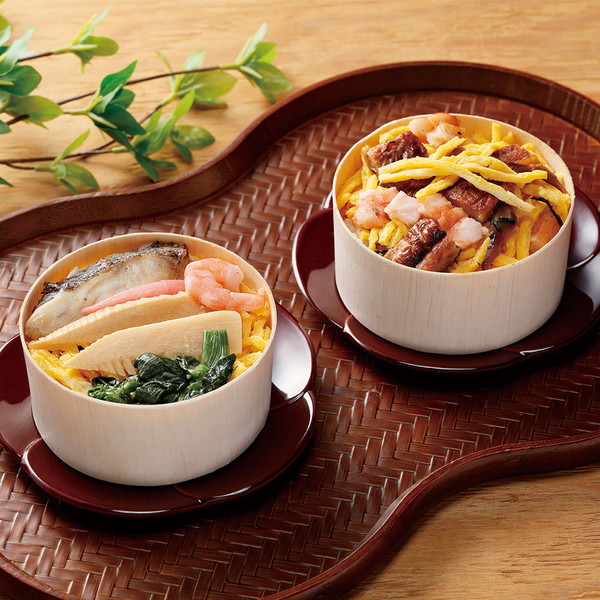 穴子や海老をちらして、錦糸卵で仕上げた風味豊かなちらし寿司と真鯛の柚庵焼、竹の子、菜の花など春らしい具材のちらし寿司をセットにしました。
