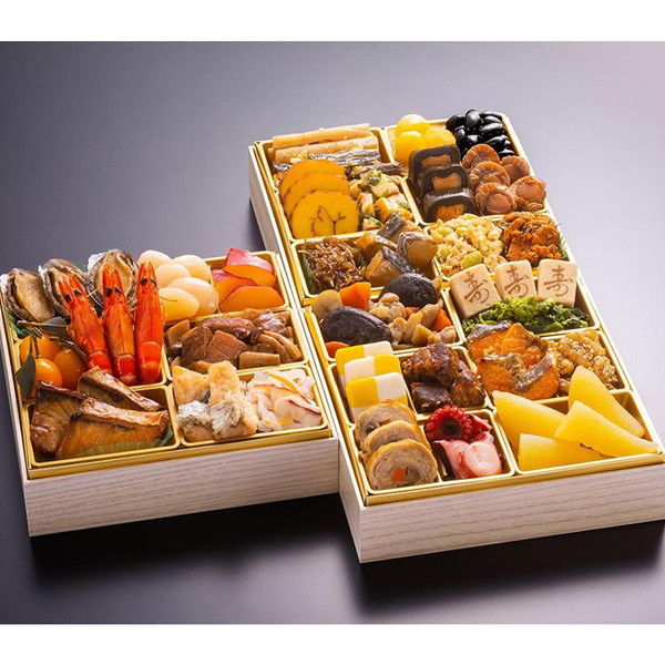 お煮しめ、市松錦玉子、豚角煮、鶏三色巻、柚子酢たこ、寿高野豆腐、菜の花のお浸し、銀鮭味噌焼、胡麻胡桃、味付け数の子