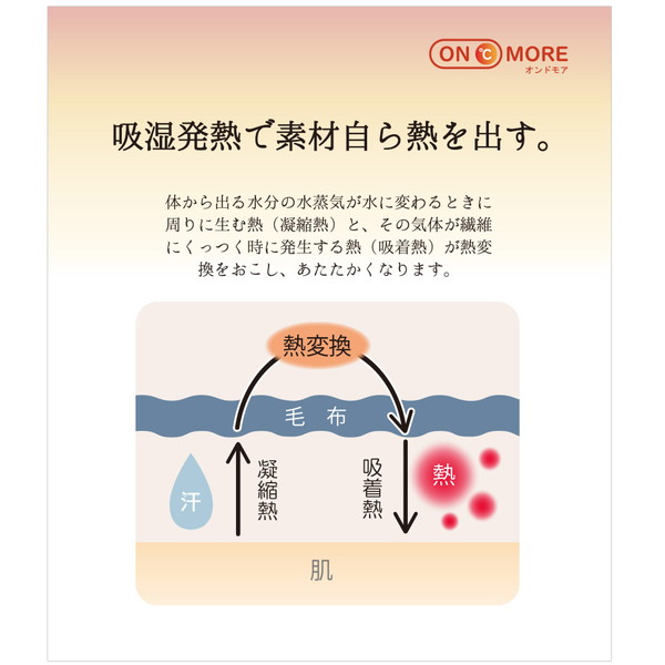 肌から出る汗や、空気中の水蒸気などの水分を、繊維が吸収する際の「凝縮熱」を利用し、吸着熱によって発熱します。