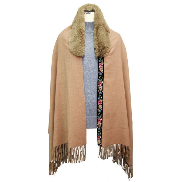 シェニールテープ、フェイクファー、フリンジを使用した華やかなストール、カジュアルな装いではストールとして、キレイ目なスタイルでは羽織でもストールでもお洋服に合わせてコーディネートをお楽しみ頂けます。